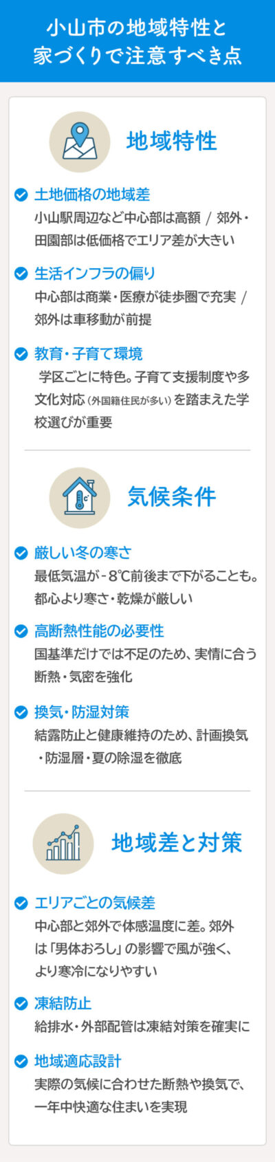 これらの特性から、小山市での家づくりでは以下の点を考慮することが重要です。