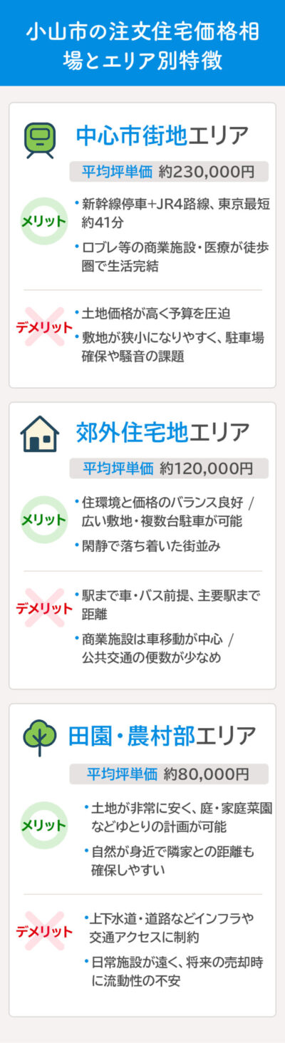 小山駅徒歩15分圏内では約230,000円となっている一方、郊外住宅地では約120,000円、田園地帯では約80,000円と大きく下がるなど、総予算3,500万円~5,000万円の範囲内でも選択肢は広がります。