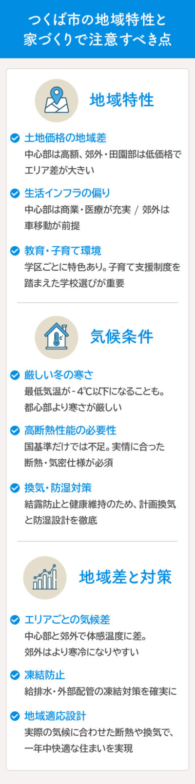 これらの特性から、つくば市での家づくりでは以下の点を考慮することが重要です。