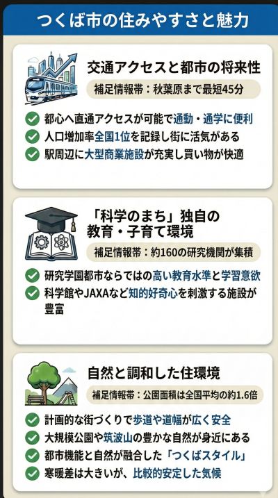 つくば市は、研究学園都市としての魅力、都心へのアクセスの良さ、豊かな教育環境、自然環境と都市機能の調和など、多くの魅力を持つ街です。