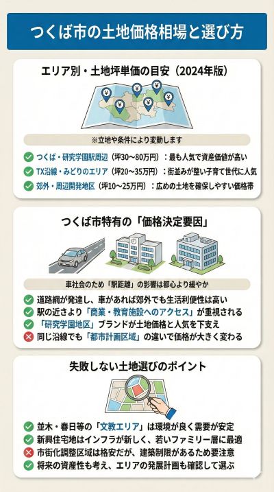 しかし、土地価格は坪単価15万円から50万円超まで立地により大きく異なり、駅からの距離や研究学園地区との位置関係、都市計画区域など複数の要因が複雑に影響します。