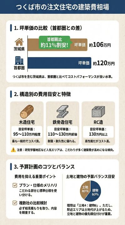 ただし、つくば市の場合、研究学園地区の駅近エリアでは土地価格が割高になる傾向があり、建物の予算を圧迫するケースもあります。