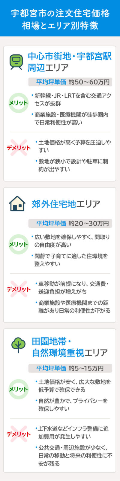 | 宇都宮駅周辺エリア | 通勤・通学重視、都市的な利便性を求める方 | 交通利便性、商業施設の充実 | 土地価格の高さ、敷地面積の制約 | 約50万円〜約60万円 |