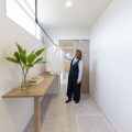 浴室・脱衣スペース・洗面スペースをそれぞれ独立させ、広々としたランドリールームを確保しました。家族が同時に使用しても気を遣わない、プライバシーに配慮した動線設計です。同じ敷地内に住むご両親が気軽に訪ねてこられるよう、勝手口も設置しています。