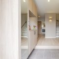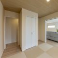 リビングの隣には落ち着きのある和室を設けました。お子さまが伸び伸びと遊べるスペースとしても活躍し、少し奥まった配置が心地よい安らぎを生み出しています。玄関は引き戸を採用し、小さなお子さまから将来の暮らしまで、安全面に配慮した設計としました。